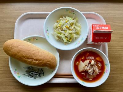 今日の給食は、コッペパン、牛乳、ポークビーンズ、キャベツとコーンのサラダ、にぼしです。大豆がたっぷりなので、いつもより『たんぱく質』の量が多いです。
