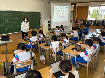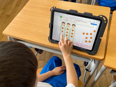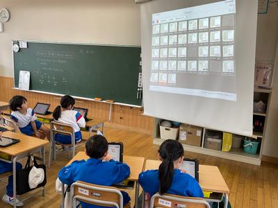 3年生が初めて『わり算』の学習に取り組んでいました。タブレット上で『いちご』を実際に操作できるので、理解度が高まります。みんなの考え方をスクリーンで知ることもできます。