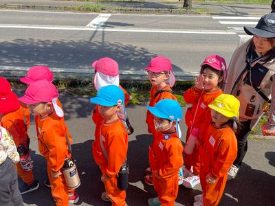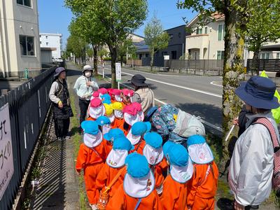 今日はみんなで学校の周りを『おさんぽ』です。歩きながら、交通ルールを守る大切さを知ります。