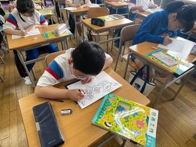 5年生図工で『ながいながいヘビ』を描いていました。グネグネと重なる部分の表し方を学ぶためです。「この胴体の上にあって、この胴体の下をくぐって…。」悩んでいました。