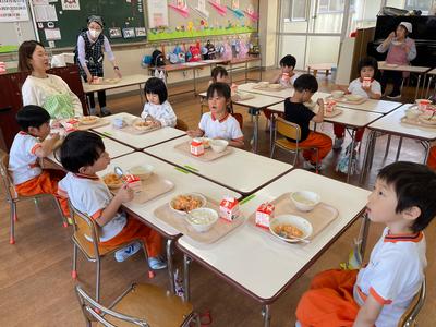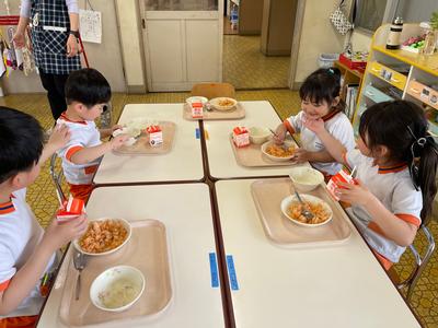 【幼稚園】たんぽぽ組 はじめての給食です!