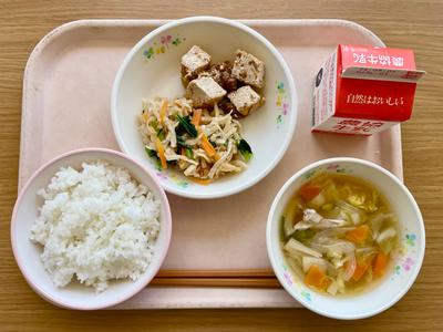 今日の給食は、ごはん、牛乳、揚げのおかか醤油炒め、青菜と切り干し大根のおひたし、鶏五目汁の『アイアン・歯ッピー献立』です。いつもは2.5㎎前後の鉄分ですが、今日は3.8㎎もあります!