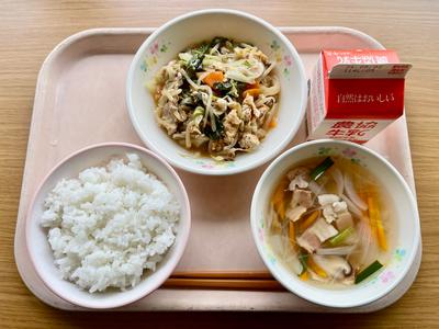 今日の給食は、ごはん、牛乳、豚肉と揚げのみそ炒め、春雨スープです。豚肉・キャベツ・揚げ・みそ、抜群の相性です!