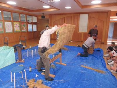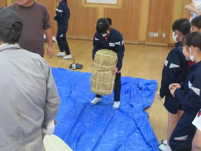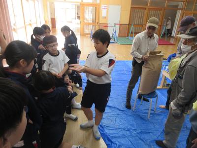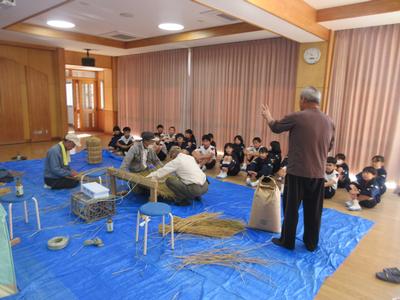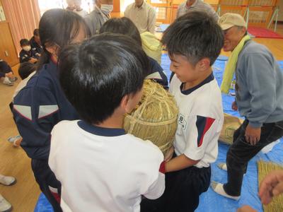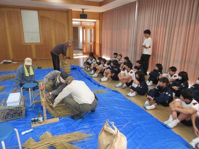 5年生は赤米奉納に向けた米俵づくりを見学しました。地域の赤米作業チームの方に来校していただき、俵の編み方や米の入れ方などを学びました。実際に30キロの米俵を持ち上げ、その重さに驚き、先人が奈良の都まで運んだ歴史に感銘を受けていました。