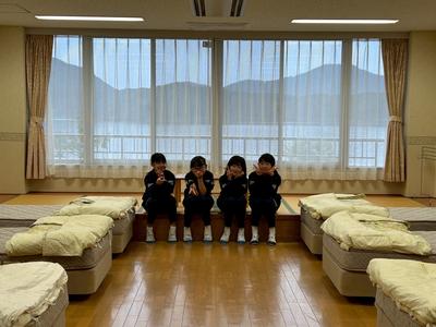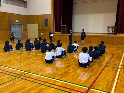 5年生は、赤米奉納後、宿泊学習を体験しています。2日目の今日は、朝のつどい後、レクリエーションをして楽しんでいます。