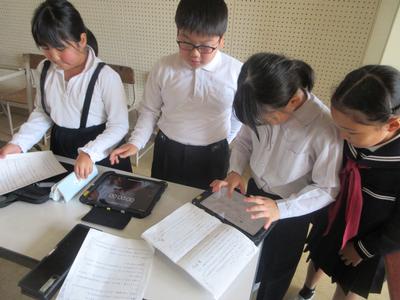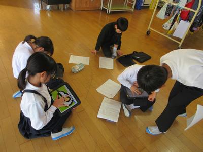 3年生は、学習発表会で、校外学習で見学した場所やふるさとのお宝について、調べたことや学んだことを発表します。今日は、iPadで作成した資料をもとに、グループで発表練習をしました。それぞれのグループが練習するのに相応しい場所を自分たちで探し、一生懸命練習に取組んでいました。