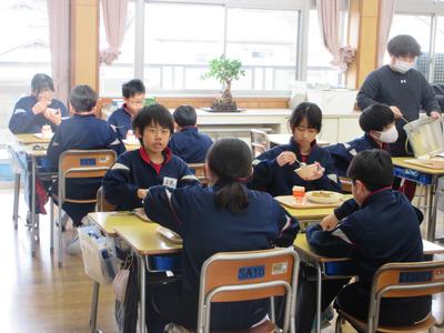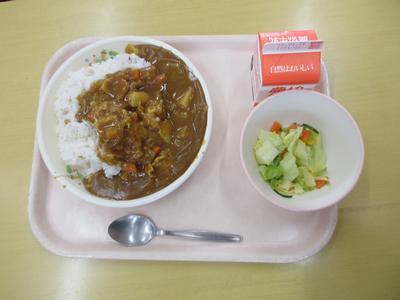 今日の給食は、ポークカレーライス・ドレッシングサラダ・牛乳でした。子どもたちが大好きなカレーライスは大盛りカレーでした。余ったサラダや牛乳もみんなで手分けして、完食しました。