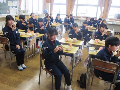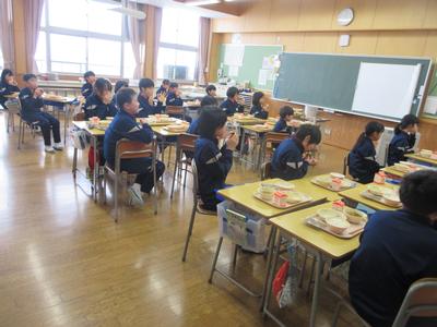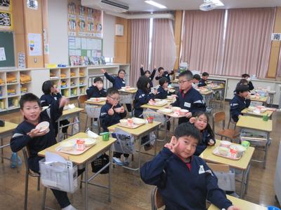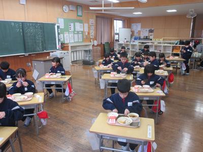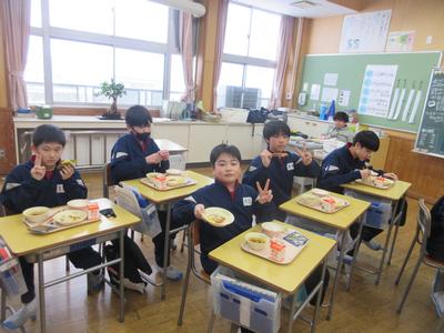 今日の給食は、恵方巻き・豆腐のすまし汁・牛乳でした。自分たちで恵方巻きをつくり、今年の縁起の良い南南東の方角を向いて食べました。