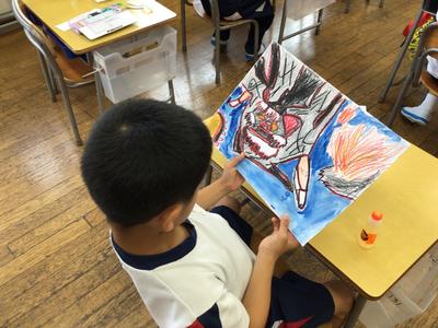 南中山地区に伝わる伝統行事である「獅子返し」のことを地域の方は、親しみを込めて「おしっさま」と呼んで大切に受け継いできました。子どもたちは、おしっさまの絵を描きました。