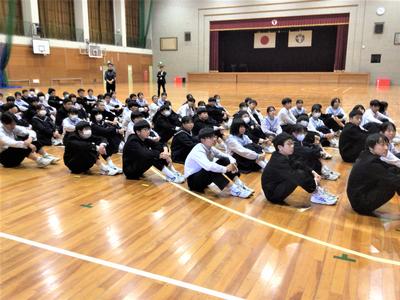 修学旅行に向けて学年集会が行われました。班で行動する際の注意点や決まりについて確認した後、班決めを行いました。