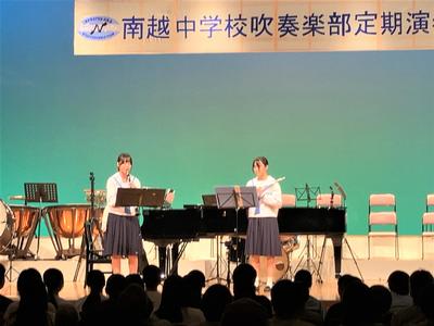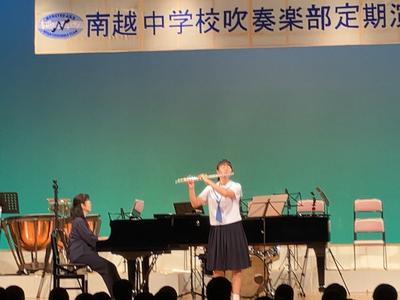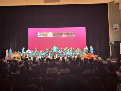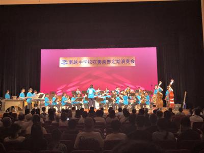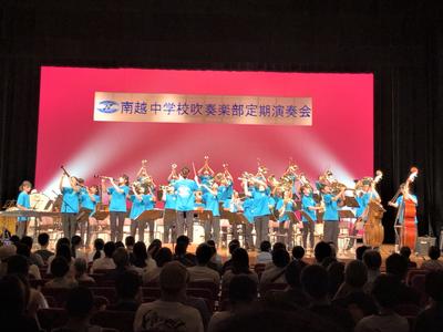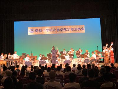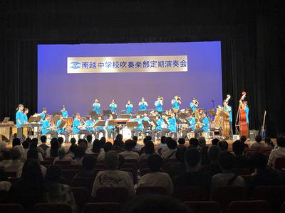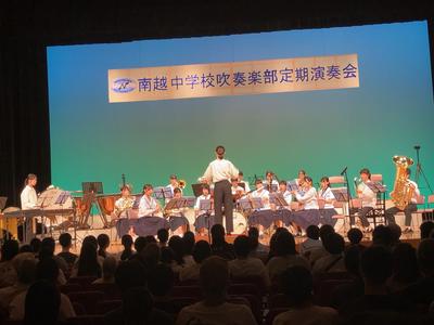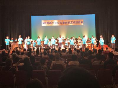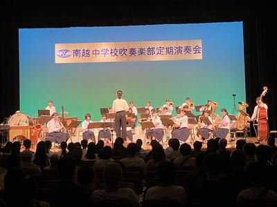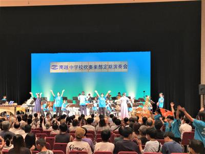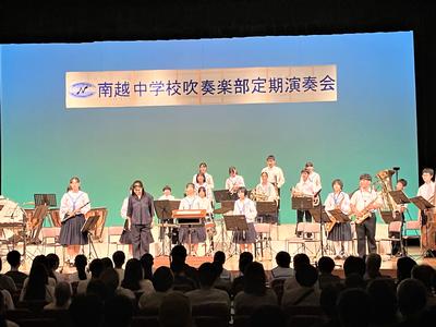 第10回南越中学校吹奏楽部定期演奏会が、21日、いまだて芸術館で行われ、たくさんの方々にご来場いただきました。今年のスローガン「響 ~最後の音まで全力疾走~」の名の通り、部員一人ひとりが最後の一音まで心を込めて演奏し、会場全体が感動に包まれました。特に3年生にとっては最後の舞台となり、思いを込めた熱演が聴く人の心を強く打ちました。保護者の皆さんの温かなご支援にも支えられ、心あたたまる素晴らしい演奏会となりました。