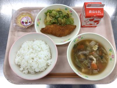 ごはん、牛乳、カマスサワラフライ、キャベツのごま和え、ふるさとあじわうみそ汁、