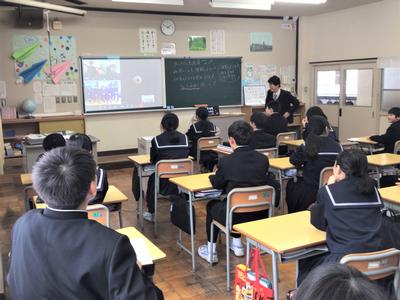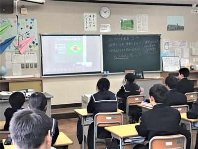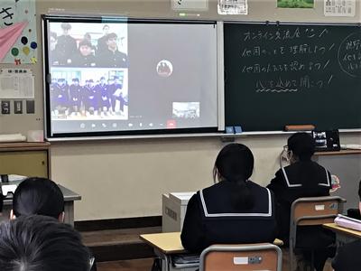 武生第一中学校に在籍する外国籍の生徒と、本校1年生がオンライン交流を行いました。この交流会は、市内の中学生が、さまざまな国籍や文化があることを知り、広い視野で物事を考えようとする態度を養うことを目的として開催されたものです。交流会では、母国の紹介をはじめ、文化や生活習慣、学校生活の様子などについて、分かりやすく紹介していただきました。本校の生徒たちは、画面越しの話に熱心に耳を傾け、うなずきながら聞く姿が見られました。また、互いに質問を交わす場面もあり、国や文化の違いを身近に感じながら、相手を知ろうとする気持ちが自然と広がる温かな時間となりました。
