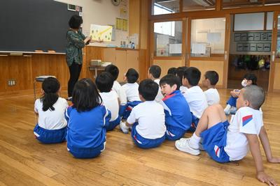 地域のボランティアの方による読み聞かせがありました。みんな、興味津々にお話に耳をか傾けていました。 |