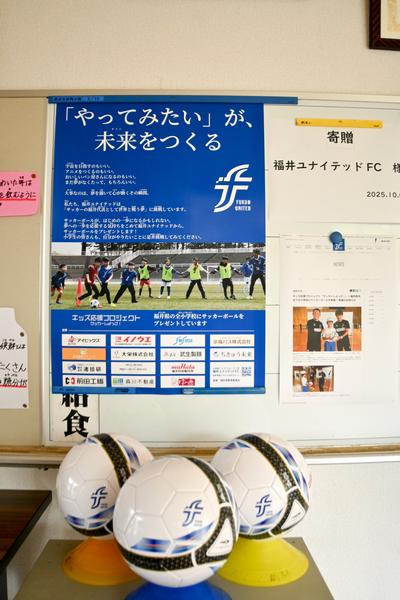 ふくいユナイテッドFC様よりサッカーボールの寄贈がありました。ありがとうございました。サッカーの授業や休み時間に使わせていただきます。
