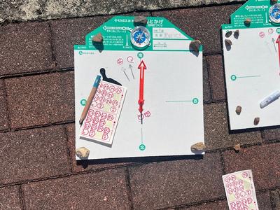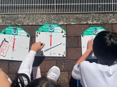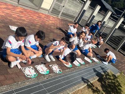 今日は1日、雲もなく太陽がずっと出ている良い天気の日でした。3年生は、理科の観察で1時間ごとに太陽と雲の関係を観察し、それぞれの位置にシールを貼りました。太陽の動く速さは時刻で変わったかな、影はどんな位置にでていたかな、太陽の動く方向はどうだったかな、観察をもとに授業で考えていきます。 |