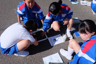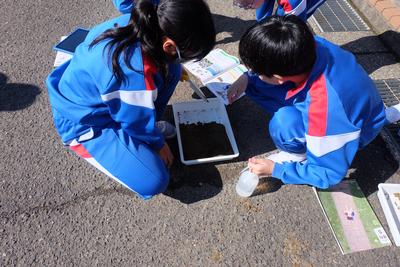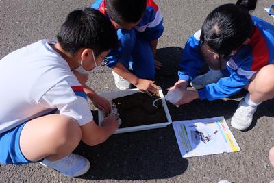 5年生は、侵食・運搬・堆積という流れる水の働きについて、実験・観察を通して調べます。今日は、土をバットに入れて地面を作り、川の道筋をつけた後に水を流し、変化を観察しました。水の働きでけずられていたのは、カーブの側・内側どちらだったでしょうか。 |