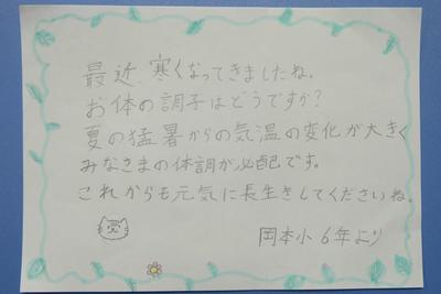 国語「みんなで楽しく過ごすために」と総合的な学習時間の学習で、「どのような活動を行えば、地域の方が楽しく過ごすことができるか」ということを話し合いました。その中で、出された地域のお年寄りの方にお手紙を書くといいのではないかという意見が出され、実行にうつしました。公民館に自治振興会の社会福祉部の方を通じて渡してもらえるように、自分たちで依頼にもいきました。 |