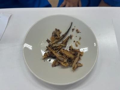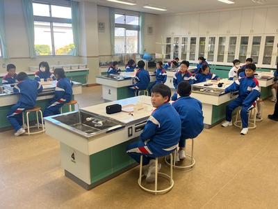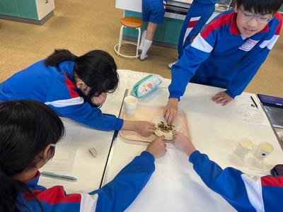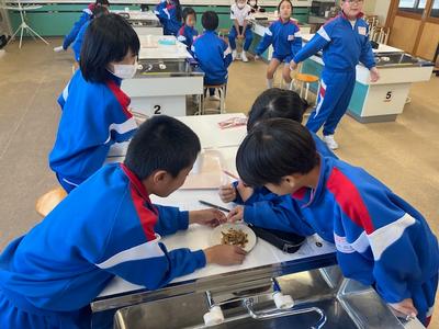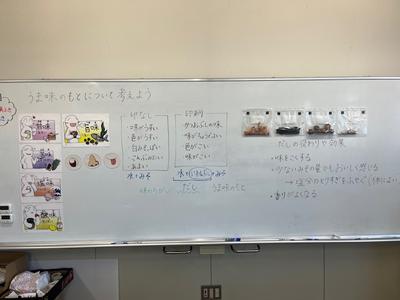 栄養教諭の先生と「食べ物のうま味のもと」について考えました。お湯に味噌だけを溶かしたものと、お湯で「いわし節」でだしをとってから味噌を溶かしたものを飲み比べて「うま味」の違いを感じとりました。食べ物を味わいながら食べることは、人間を豊かにすることに気がついたでしょうか。 |