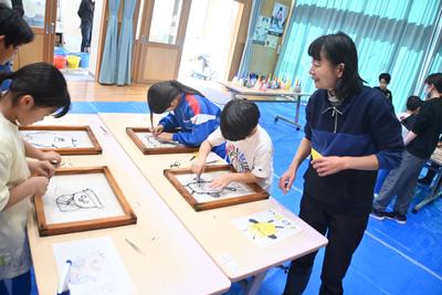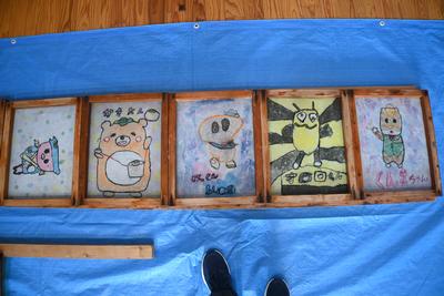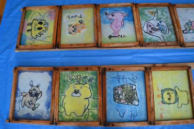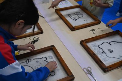 和紙組合とPTA紙漉き部の方の協力を得て、一人一人が絵漉きに挑戦しました。和紙の原料の上に色のついた紐で形を作り、中に染料を流し込んで絵を仕上げました。和紙の材料に染み込んでいく染料の量を調整しながら、世界に一つだけの和紙作品を仕上げました。 |