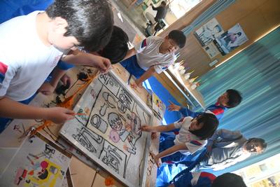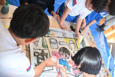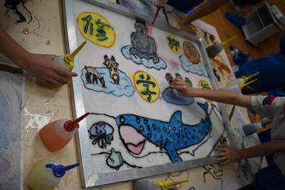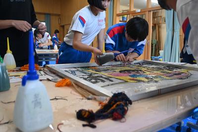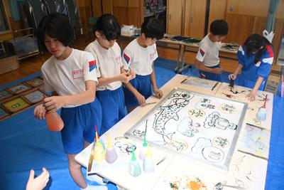 和紙組合とPTA紙漉き部の方の協力のもと、6年生が卒業制作として、3グループに分かれて協同絵漉きに挑戦しました。修学旅行などの思い出の場面を、和紙の材料の上に紐で輪郭を作った後、染料を流し込んで色付けしました。細かい部分まで丁寧に作りこんで、協力して大作を仕上げることができました。乾燥させて完成です。出来上がりが楽しみです。 |