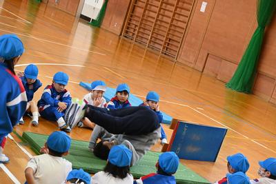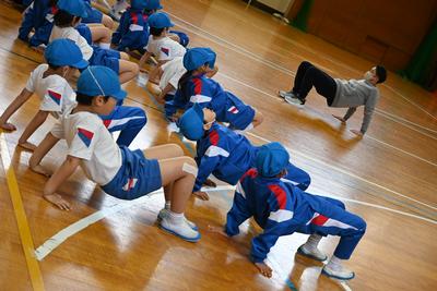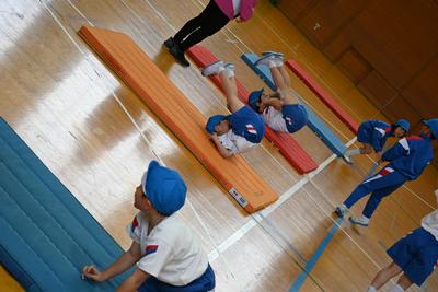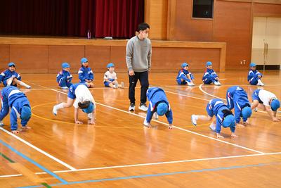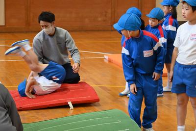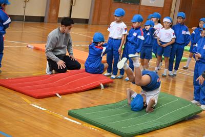 越前市低学年体育支援事業として越前体操クラブの永田先生を講師に、1・2年生が体操の基本について教えてもらいました。しっかり体を動かして体を温めた後、後転のコツを聞き、繰り返し練習をしました。少しづつ、膝をつかずに回ることができるようになっていきました。 |