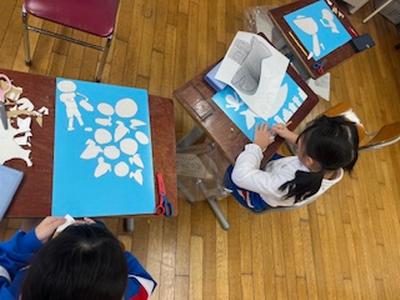 版画づくりを始めました。厚みのある紙を切り貼りして、絵を作っていきます。できあがりが楽しみですね。 |