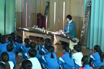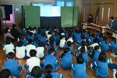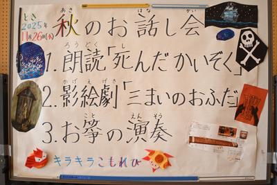 いつも学校で読み聞かせをしてくださる「キラキラこもれび」さんと、琴を演奏する「アララギ楽苑」さんによる秋のお話し会がありました。影絵で表現したり、ストーリーに合わせて琴の演奏の調子が変わったりと、とても創意工夫された読み聞かせになっていて、児童は本の世界に引き込まれていました。ありがとうございました。 |
