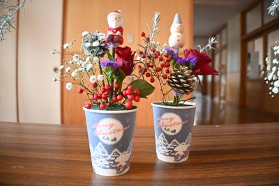 フラワーアートクラブの皆さんの作品です。クリスマスが楽しみになる作品がたくさん飾られています。 |