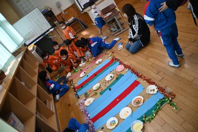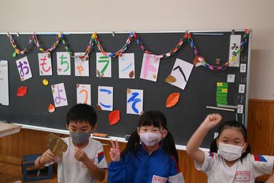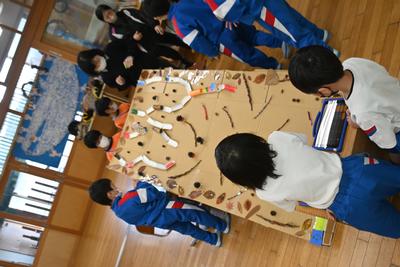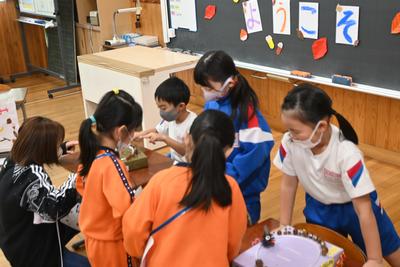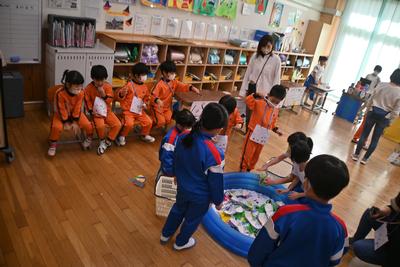1・2年生が、認定こども園岡本の年長さんの園児を招いて、おもちゃランドを行いました。自分たちで工夫して作った、トントン相撲・どんぐり的入れ・どんぐりころがし・魚釣り・的当て・ゴム射的などで遊んでもらおうと、優しく説明をしたり、一緒に挑戦したりしました。 |