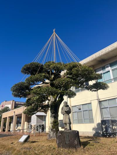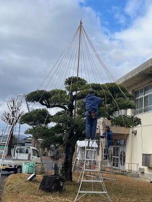 校舎前の「ヒイラギモクセイ」の大木に雪つりをして冬に備えています。