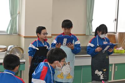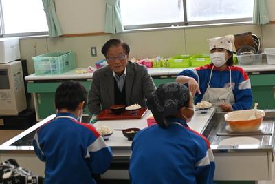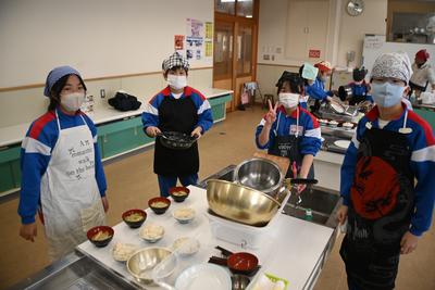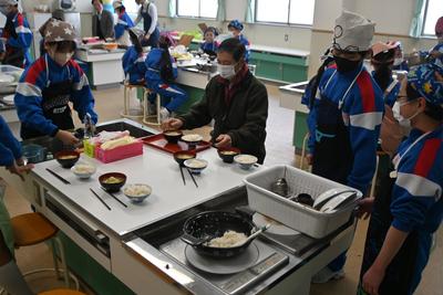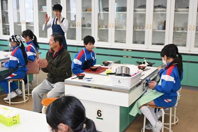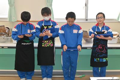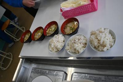 5年生が、米作りでお世話になった農家の方をお迎えし、感謝の気持ちを伝える会を行いました。自分達で育てた米を研いで炊いてご飯にしたあと、大根の味噌汁を作り、一緒に食べながら、感謝の気持ちを伝えました。 |