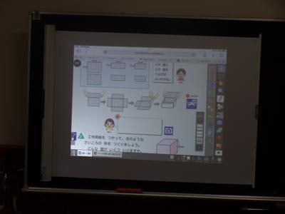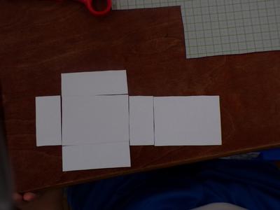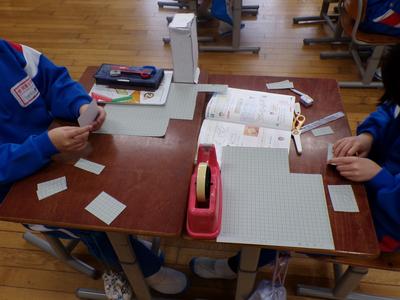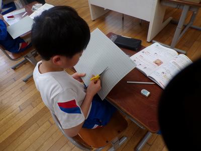 算数の授業の様子です。方眼紙を切って箱を作りました。向かい合う面の大きさが同じになるように気を付けて設計図をかきました。 |