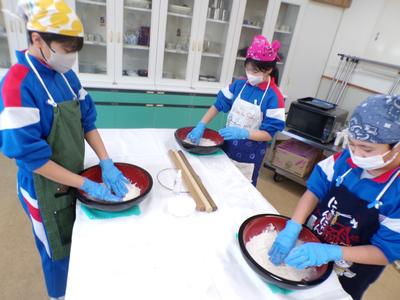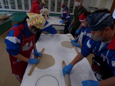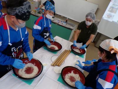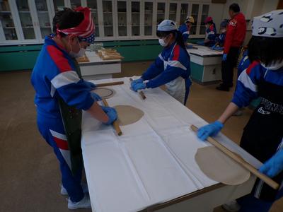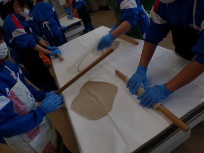 市の出前授業として「武生製麺」さんを講師に迎え、そばうち体験を行いました。年越しそばとして食べ、今立地区にはそばのお店が多いなど身近な食べ物ですが、自分でそば粉から作るのは全員初めてでした。粉と水を混ぜて塊をつくり、伸ばして麵にする作業を通して、そばへの理解を深めながら、そば打ちの楽しさを感じていました。講師の方にはお世話になり、ありがとうございました。 |