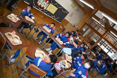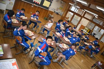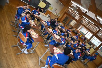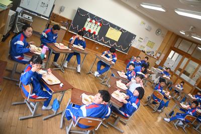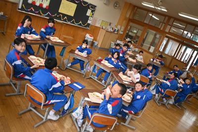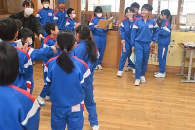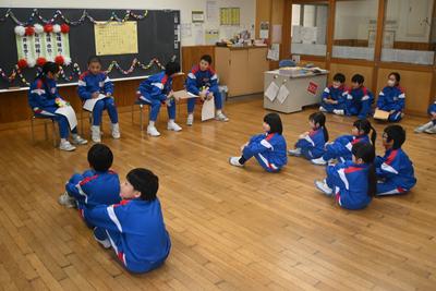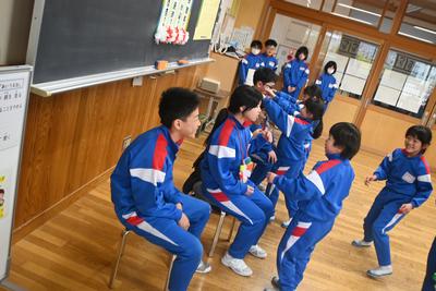 5年生が企画した「6年生を送る会」を縦割り班の教室で行いました。5年生司会のもと、プレゼント渡しやゲームをした後、感謝の気持ちを6年生に伝えました。6年生は、少し照れくさそうでしたが、とても穏やかな表情で会を過ごしていました。そのあと、6年生を囲んで給食を食べました。 |
