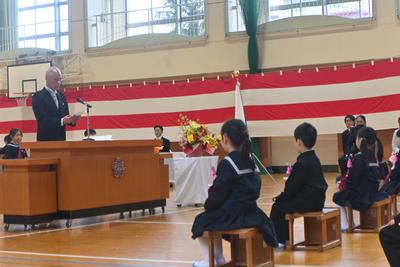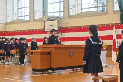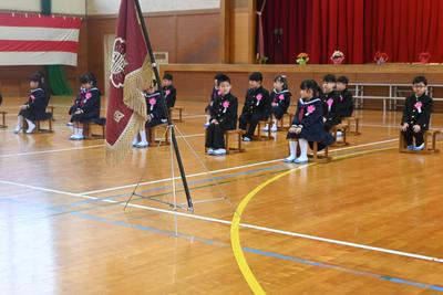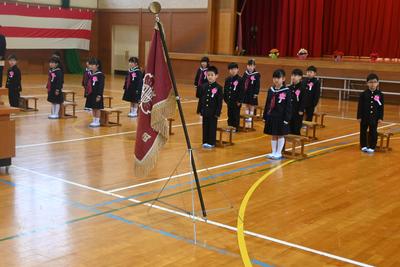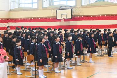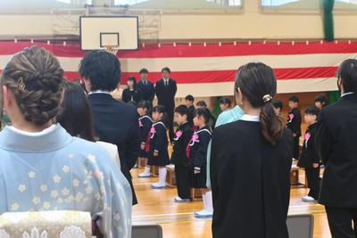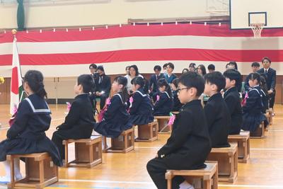 16名のかわいい新入生を迎える入学式を行いました。6年生に手を引かれた入場したあと新入生は、校長先生やPTA会長の「お祝いの言葉」をしっかり聞くことができました。初めて校歌を聞くこともできました。