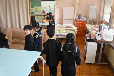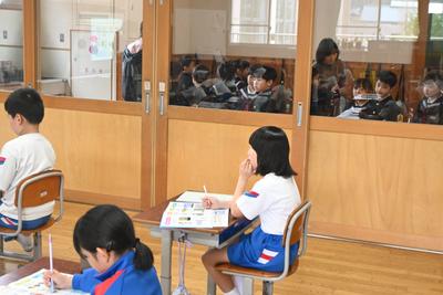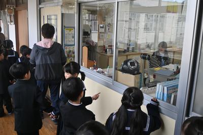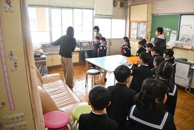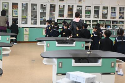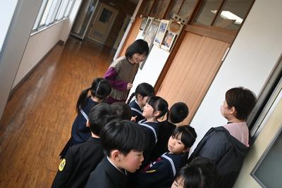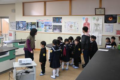 先生と一緒に学校探検をしました。保健室や理科室、校長室など、こども園にはない教室もあって驚いていました。 |