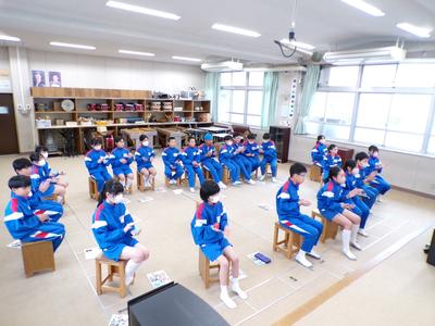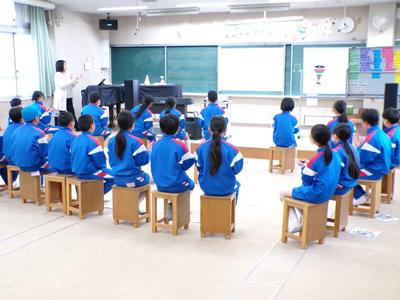 音楽の授業の様子です。新しい音楽の先生と、カスタネットを使いながらリズムをとる練習を楽しくしていました。 |
