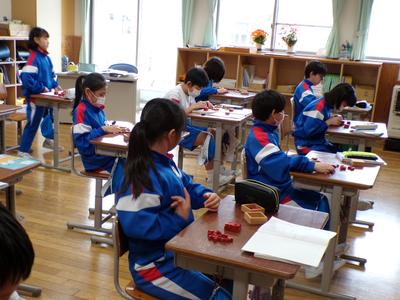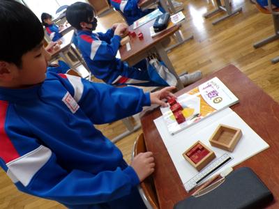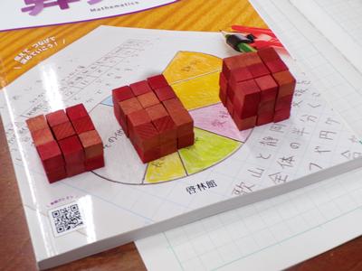 算数の授業で、1㎤の立方体を使って様々な大きさの直方体をつくり、1㎤の立方体がいくつ必要かを調べました。最初は、分解して一つずつ数えていましたが、計算で求める方法をみんなで考えました。 |