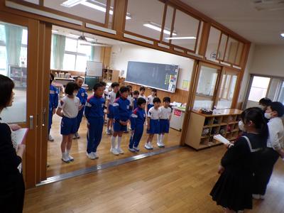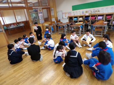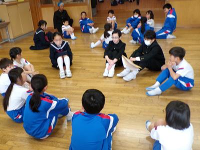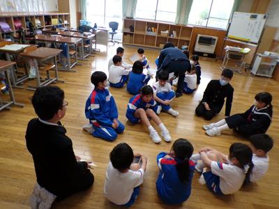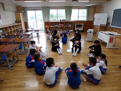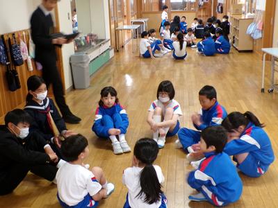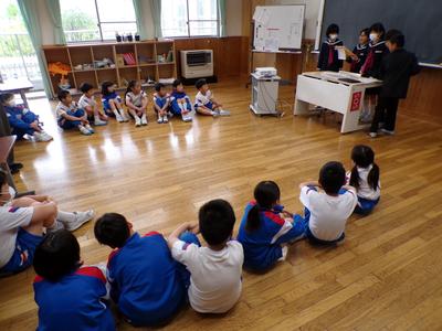 岡本小学校では、1~6年生の異学年の児童で構成される縦割り班をつくって、一緒に遊んだり、大繩をしたり、給食を食べたりすることがあります。今日は、最初の集まりで、6年生の新リーダーを中心に自己紹介をしました。1年生は少し緊張している様子でした。 |