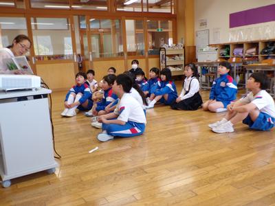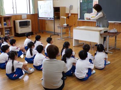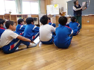 今日は、1・3・5年生の読み聞かせの日でした。1年生にとっては、初めての読み聞かせ。興味津々に話を聞いていました。 |