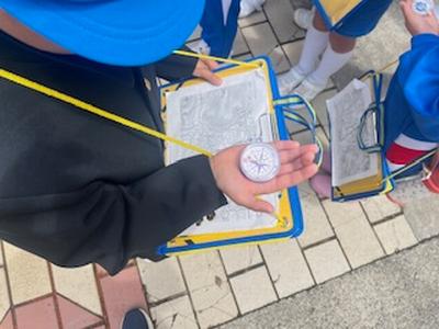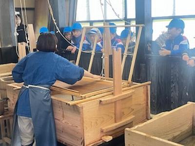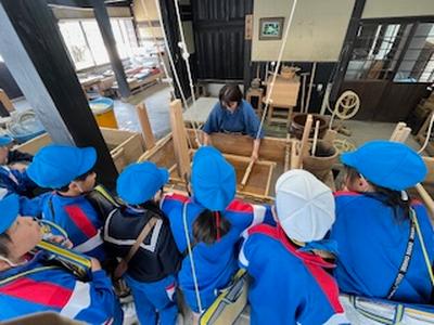 社会の学習で、方位磁針の使い方と地図の見方を学習しました。今日は、実際に郊外に出て地区の施設をめぐり、方位磁針を使って方角を確認したり、自分が今どこにいるかを地図の中で探したりしました。外に出でると、東西南北を指すのが少し難しったようですが、だんだん慣れてきました。卯立の工芸館では紙漉きの様子を見せてくださいました。 |