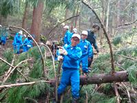 今回は、まず文室鉱山跡を見学しました。最初の山道は比較的平坦なものの、何本もの倒木がこどもたちの行く手を遮っています。今年は雪が多く、太くて若い木でも折れてしまったのだとか。それでもこどもたちはその倒木を時にはまたぎ、時には下をくぐり、けっこう楽しそうにずんずん道を進んでいきました。そして約15分後、いよいよ最後の難関に差し掛かります。そこは急傾斜、ほとんど崖のような山腹を約20メートル上がらなければなりません。多くの子が四つん這いになり、ボランティアの方に手を引いてもらったり杉の枝を杖にしたりしながら、山に挑んでいました。「がんばれ~」の掛け声が山中に響きます。そしてなんとか全員が崖をクリアし、鉱山跡にたどり着くことができました!