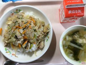 豚肉と野菜丼、鶏肉とキノコのすまし汁、牛乳でした。