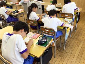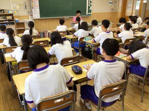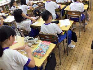 地区の敬老会では、毎年、高齢者の方々へメッセージカードをお渡ししています。ちょうど、6年生がメッセージを書いているところにお邪魔しました。