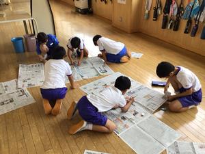 1組は算数、平方キロメートルについて学習していました。平方キロメートルが、何平方メートルになるか計算していました。1平方メートルの大きさを体感するため、新聞紙で1平方メートルの広さを作成していました。