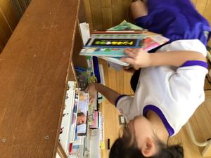 教室の本棚に本を返そうとしますが、本が入り乱れて戻せません。気付いた児童が、本棚の整頓をしてくれました。とてもすっきりした本棚になりました。