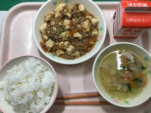登校前に玄関前の落ち葉を掃いて綺麗になったのも束の間、午前中の強風で再び落ち葉だらけになってしましました。しばらくは、そのような追いかけごっこが続きそうです。今日の給食は、ご飯、牛乳、麻婆豆腐、ジャガイモと青菜のスープでした。
