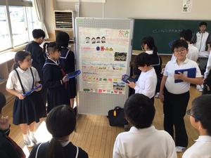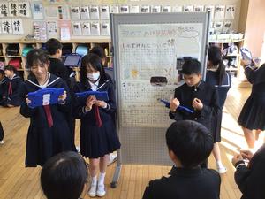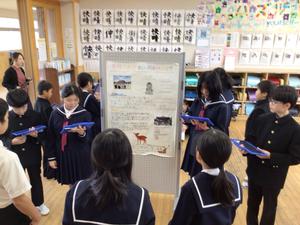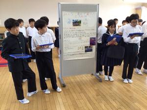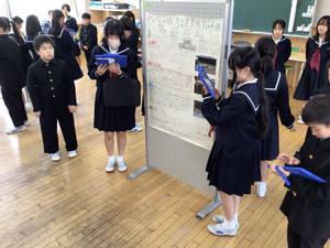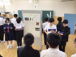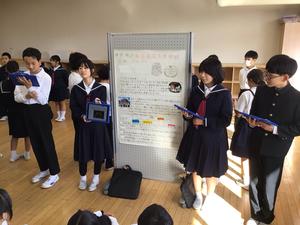 修学旅行に参加しました→分かったことを模造紙にまとめました→(時間がある時に)見てください、という流れをなくしました。修学旅行を経験して思ったことや感じたこと、後輩に伝えたいことなどを発表という形で届ける活動にしました。6年生のポスター発表は、全部で8グループあります。5年生も8グループに分かれて、6年生の発表を聞いて回りました。