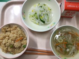 今日は、市制記念献立でした。油揚げご飯、牛乳、大根の菊花和え、麦とろ麺のすまし汁です。調理員さん、おいしい給食ありがとうございます。